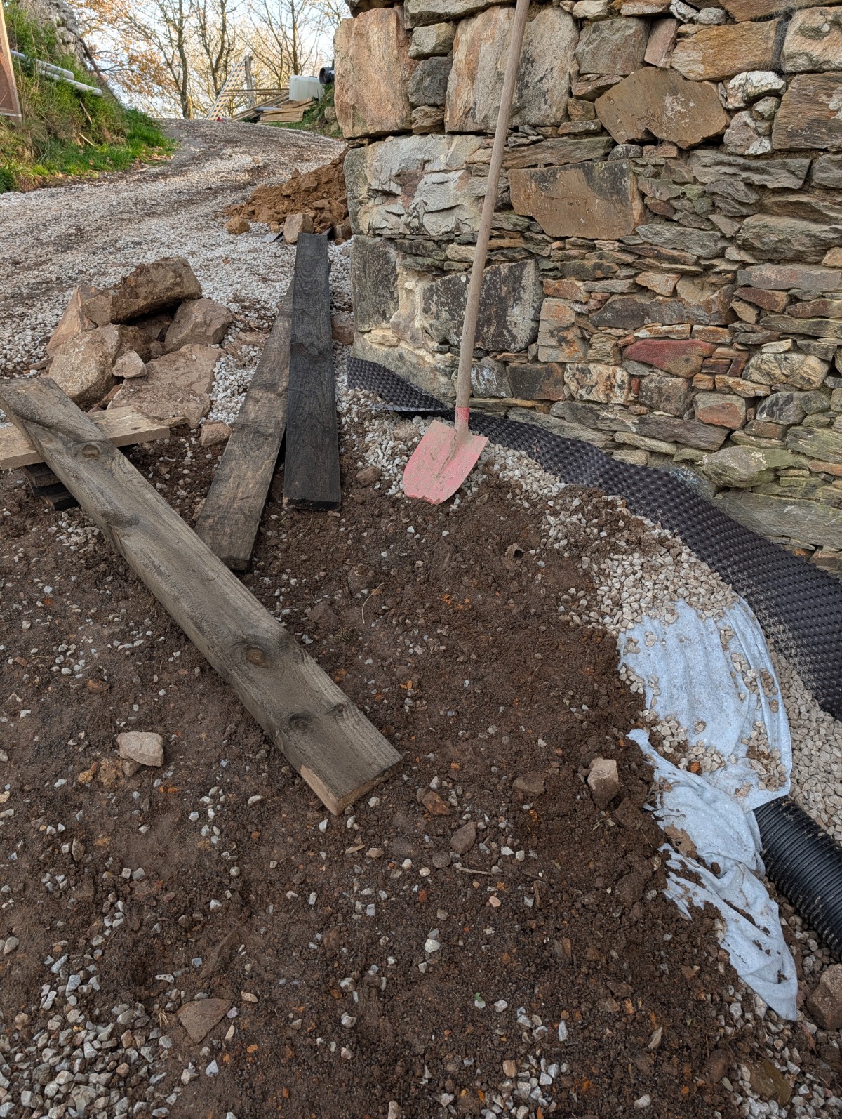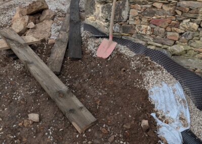 Think of this as a hidden moat. We dig a trench along the exterior wall on the uphill side, slightly deeper than the internal floor level. We line it with fabric, pop in a perforated pipe, and fill it with clean gravel. Now, when water runs down the hill, it hits the gravel, drops into the pipe, and is whisked safely away from your house before it can soak into the stonework.